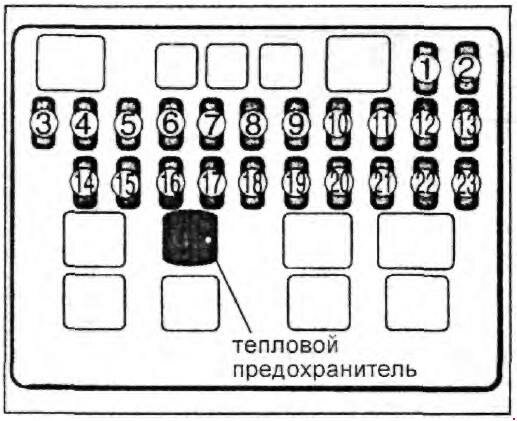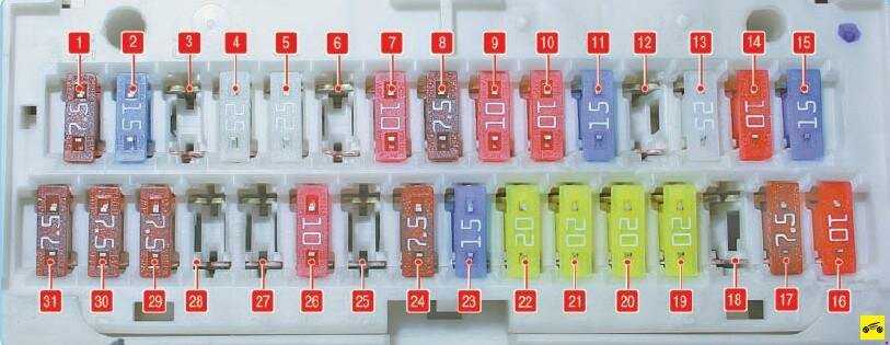 Реле и плавкие вставки в монтажном блоке, расположенном в салоне авто
