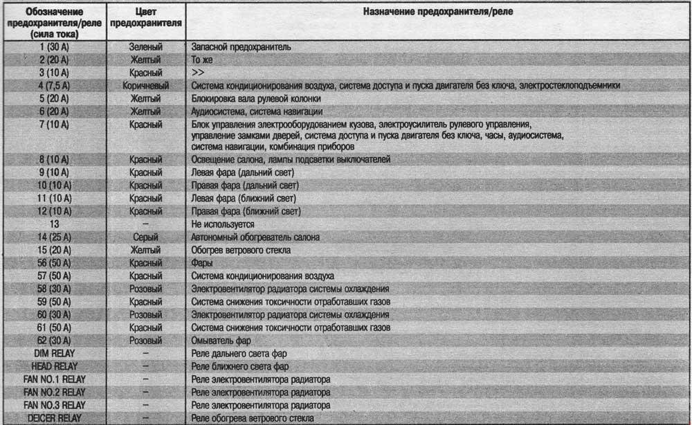 Тут приводятся обозначение и расшифровка блоков предохранителей для различных моделей автомобилей Toyota - Toyota Supra, Toyota Avensis, Toyota Corona Premio, Toyota Corolla, Toyota Auris, Toyota RAV4, Toyota Estima, Toyota Camry и некоторых других. Сами электрические схемы указанных авто вы можете посмотреть в другом разделе. Каждый из предохранителей защищает свою цепь и на панели предохранителя имеется обозначение защищаемой этим предохранителем цепи. Конечно никогда не заменяйте предохранители проволокой, даже в качестве временного устранения неисправности. Это может привести к серьёзным повреждениям проводки или даже к возгоранию. Мощность предохранителя указана на самом предохранителе. Если новый предохранитель сразу же перегорает, необходимо отыскать причину этого прежде, чем устанавливать новый предохранитель. Если у вас нет предохранителя с номинальным значением, то следует использовать предохранитель с более низким значением, как можно ближе к номинальному. Наиболее вероятной причиной перегорания предохранителя является короткое замыкание в цепи, вызванное порвавшимся или износившимся проводом. Вторая часть сборника.