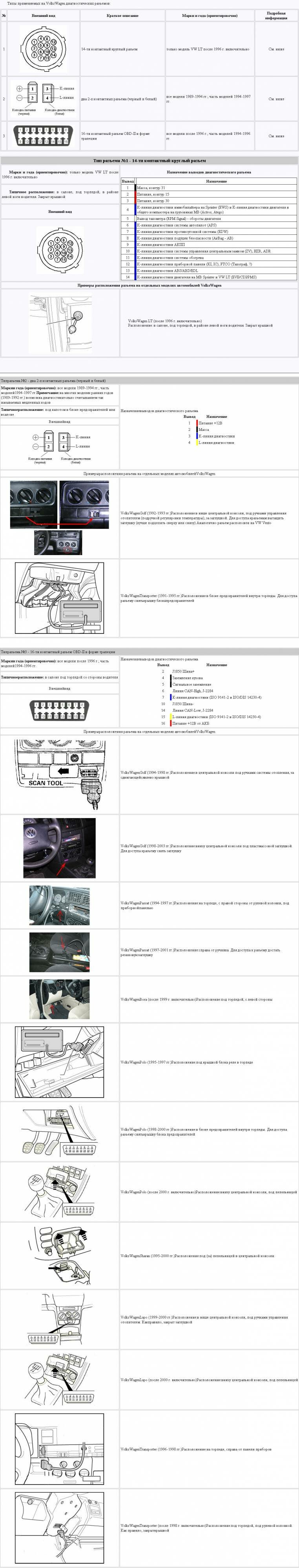 В данном справочном материале показаны три схемы диагностических разъемов для авто VolksWagen, в том числе универсальный 16-ти контактный разъем OBD-II. В конце страницы изображено типичное расположение разных типов разъёмов в фольксваген, в зависимости от модели и года выпуска. Чтоб увеличить картинку с фото - кликните на неё и далее на стрелки над схемой.