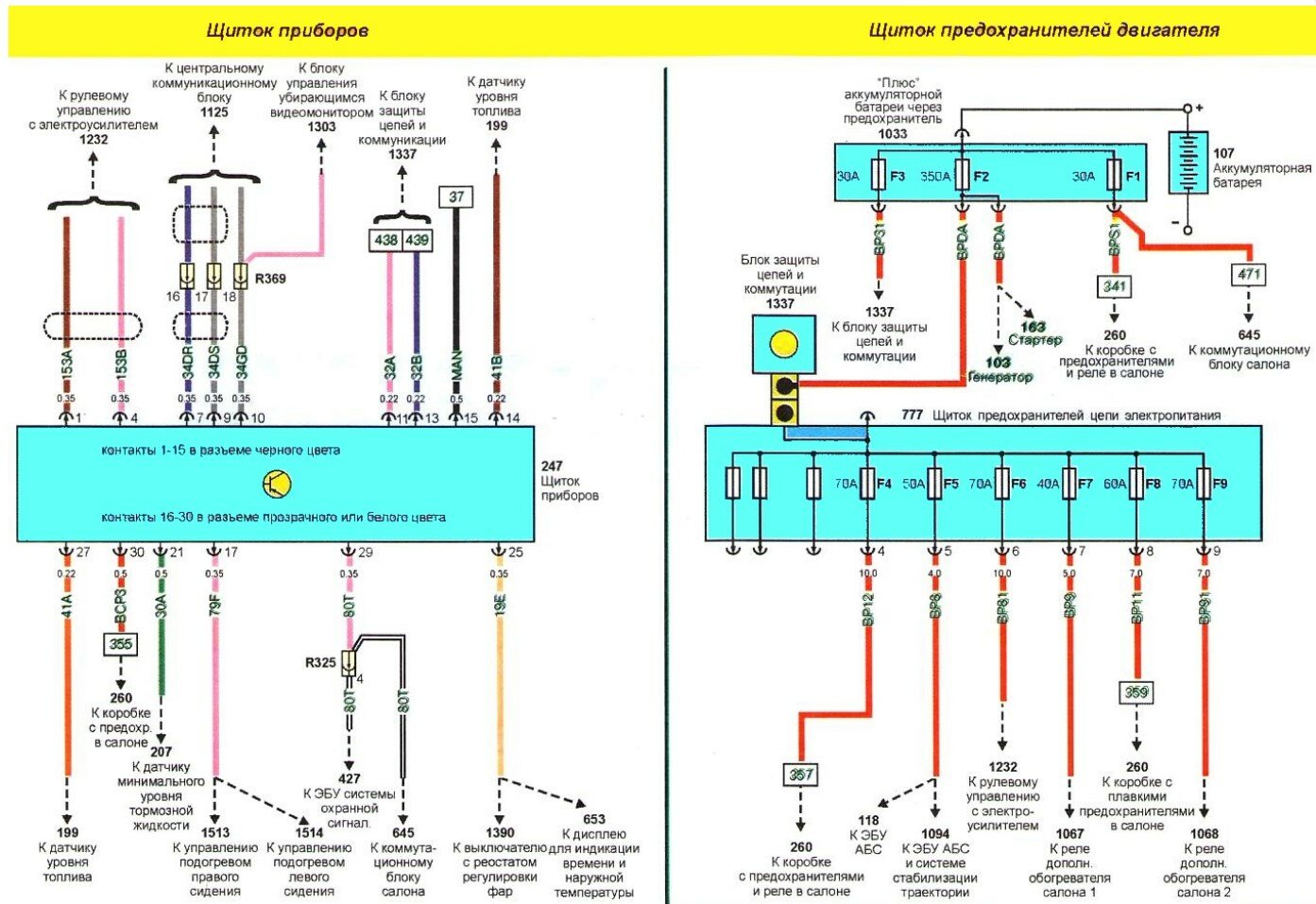 - Оранжевый, 60А — разъем блока питания, комбинированные выключатели освещения и стеклоочистителя на рулевой колонке