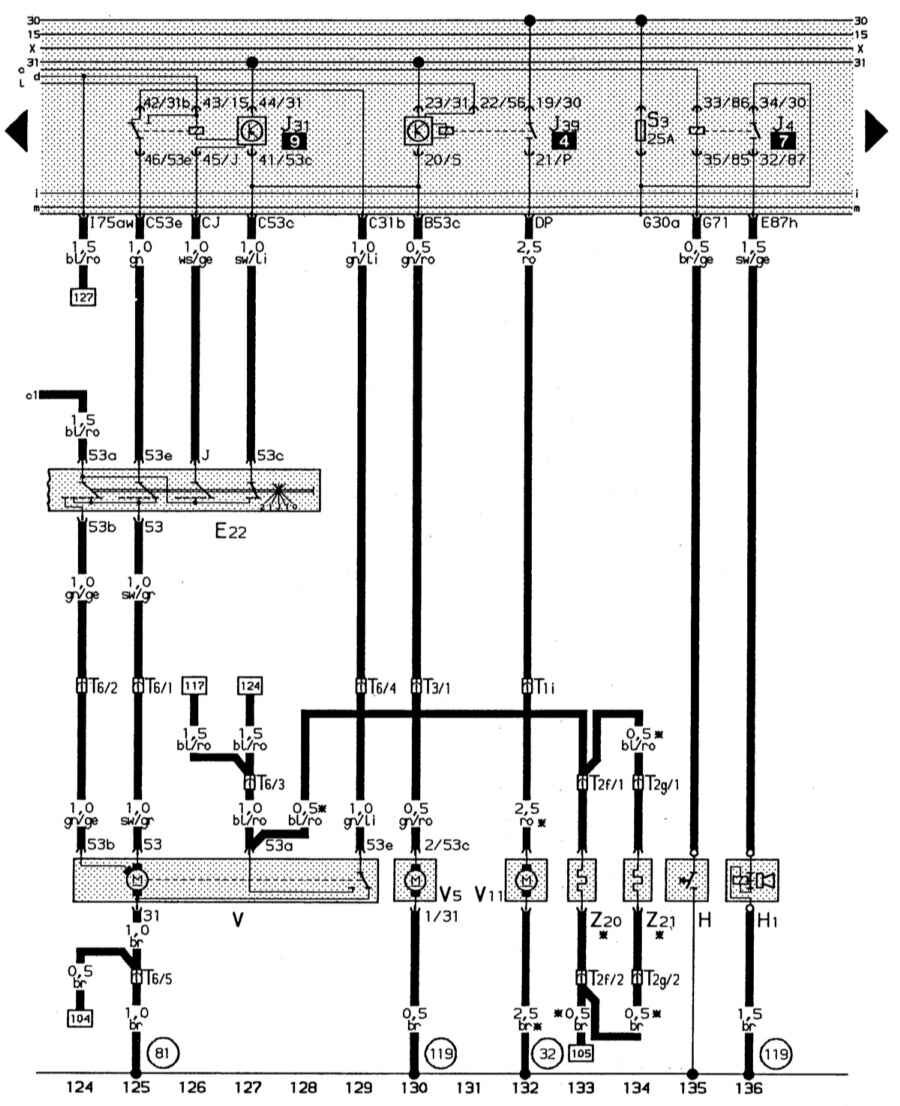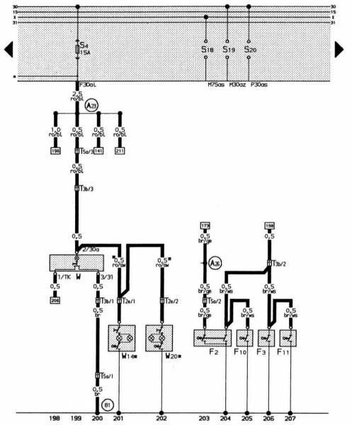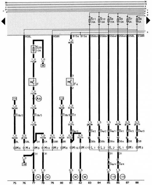 Лямбда-зонд с подогревом, электромагнитный клапан бачка с активированным углем, регулятор положения дроссельной заслонки. Цвета проводов: br – к, br/ge – к/ж, bl/sw – сн/ч, gn/sw – з/ч, sw – ч, gr/sw ср/ч, ro/ge – кр/ж, gr/ws ср/б, sw/ro – ч/кр, ge – ж, br/sw – к/ч, sw/bl – ч/сн, li/sw – л/ч, li – л, ro/sw кр/ч.