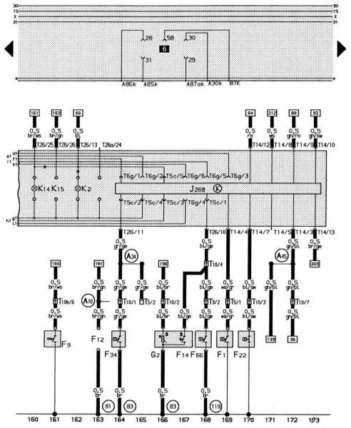 Топливный насос, система впрыска, блок управления системой впрыска Mono-Motronic. Цвета проводов: br – к, gn/ge – з/ж, ws/gn – б/з, ws/bl – б/кр, ro – кр, br/gr – к/ср, sw/li ч/л, br/li – к/л, bl/br – сн/к, gn – з, br/ro – к/кр, bl/gn – с/з, gn/ro -/кр, gn/sw – з/ч, gn/gr – з/ср, gn/bl – з/сн, sw/ws – ч/б.