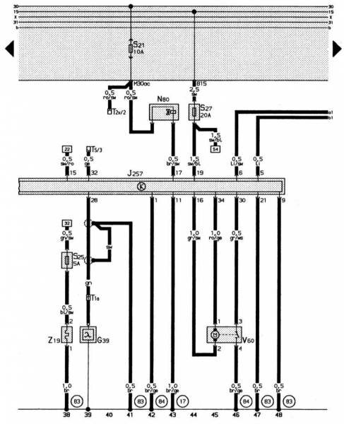 S 27 – отдельный предохранитель для системы впрыска Mono-Motronic (управление двигателем) и катушки зажигания (в дополнительном отсеке для предохранителей)
