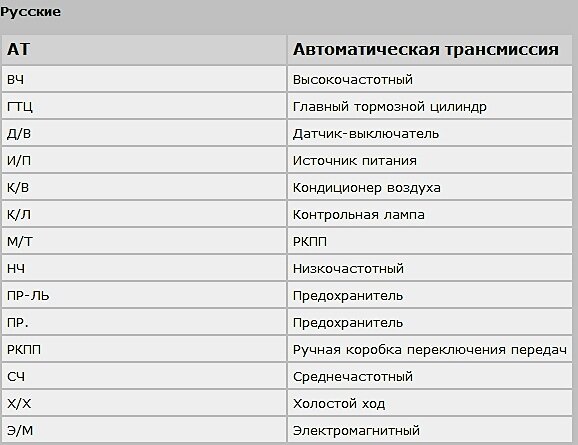 Схемы электрооборудования - используемые сокращения и их расшифровка