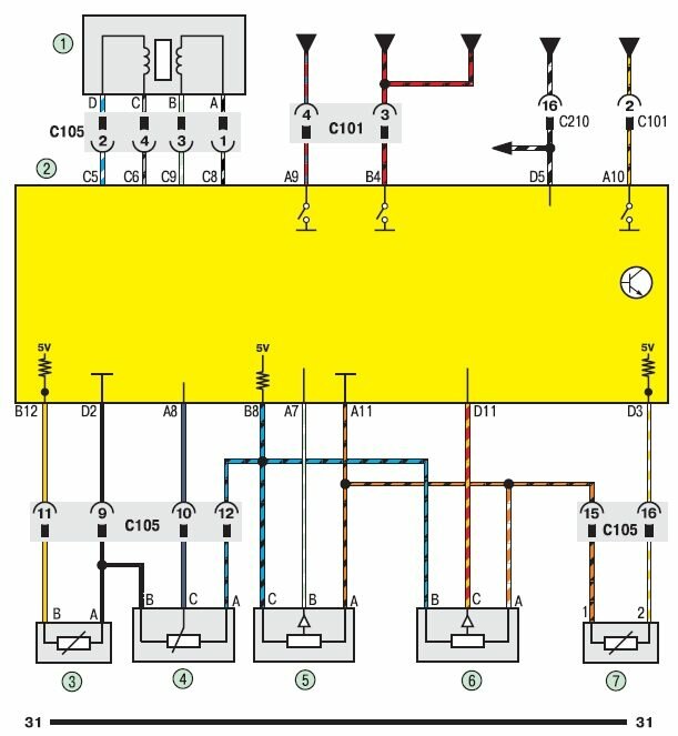 1 - предохранитель (15 А); 2 - электромагнитный клапан рециркуляции отработавших газов; 3 - двухходовой клапан; 4 - предохранитель F17 (15 А); 5 - гравитационный клапан; 6 - электронный блок управления двигателем; 7 - комбинация приборов; 8 - датчик скорости автомобиля (для автомобилей, оснащенных автоматической коробкой передач).
