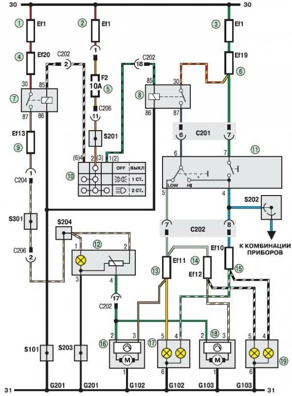 1, 2, 3 - плавкие вставки (80 А); 4, 15 - плавкая вставка (20 А); 5, 9, 13, 14 - предохранители (10 А); 6 - плавкая вставка (25 А); 7 - реле; 8 - реле фар; 10 - переключатель наружного освещения; 11 - переключатель указателей поворота; 12 - переключатель корректора фар; 16 - корректор левой фары; 17 - фара левая; 18 - корректор правой фары; 19 - фара правая автомобиля Daewoo Lanos.