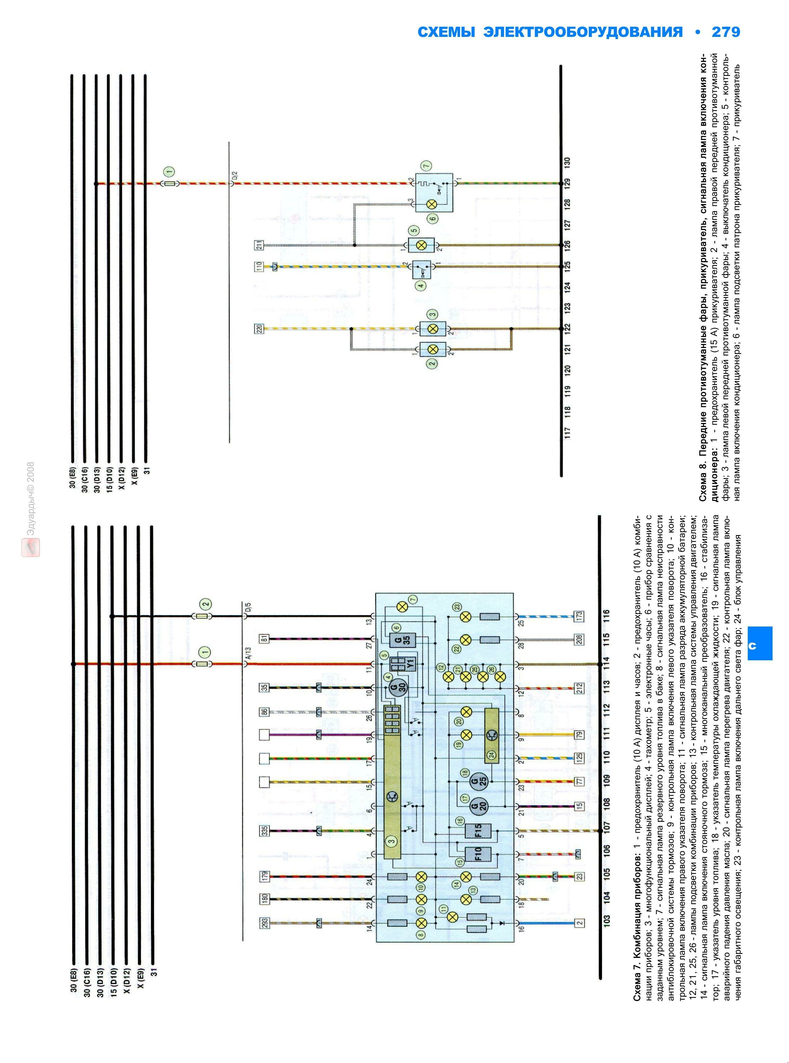 Электросхема передних противотуманных фар, прикуривателя, сигнальной лампы включения кондиционера, комбинации приборов