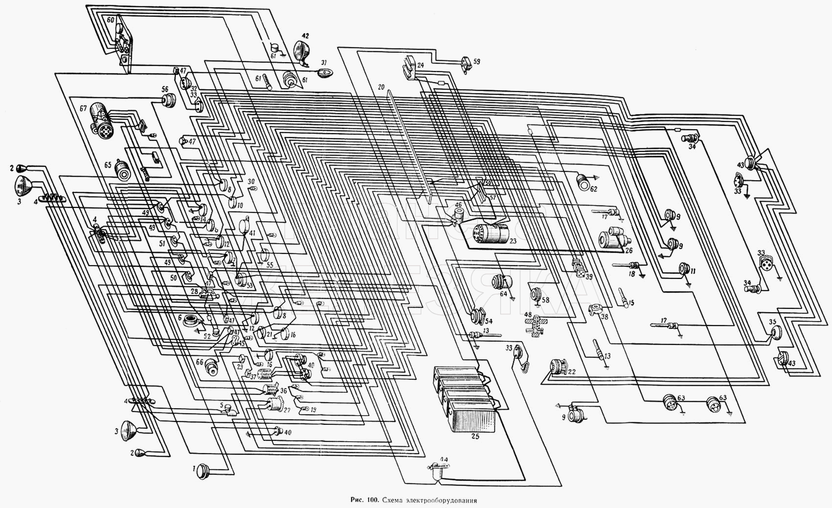 Al — Блок предохранителей и реле, A3 — Прерыватель стеклоочистителя, А6 — Прерыватель указателя поборота, А7 — Магнитола, А8 — Реле блокировки демультипликатора, BAI, BA2— Громкоговоритель, ВК — Датчик температуры, ВР1.ВР2 — Датчик давления воздуха, ВРЗ — Датчик давления масла, ВР4.ВР5 — Датчик аварийного давления воздуха, BPI0 — Датчик аварийного давления масла, BV2 — Датчик спидометра, BV3 — Датчик скорости, ЕКЗ,ЕК4 -Свеча ЭФУ, Е1,Е2 — Фара головная, ЕЗ,Е4 — Фара противотуманная, Е5,Е6 — Передний фонарь, Е7 — Фонарь, Е8 — Фонарь номерного знака, Е9...Е11 — Фонарь знака автопоезда, EI2 — Фонарь подкузовной, Е13,Е14 — Боковой указатель поворотов, EI5.EI6 — Фонарь габаритный, Е17,Е18 — Задний фонарь, Е20 — Фонарь заднего хода, Е23.Е24 — Плафон освещения кабины, Е25 — Плафон освещения двигателя, Е26 — Фара — прожектор, Е28,Е27 — Плафон освещения спального места, ЕК1,ЕК2 — Фонарь освещения стеллажей, ЕЗО — Нагреватель зеркал, EL1...EL6 — Лампа подсветки приборов, FU1 — Предохранитель 60 А, FU2 — Предохранитель 30 А, FU3—FU9 — Предохранитель 8 А, FU11 — Предохранитель 16 А, G — Генератор, GBl, GB2 — Аккумуляторная батарея 6СТ I90A, НА 1 — Комплект электрических сигналов, НА2 — Сигнал пневматический, КК1 — Добавочное сопротивление, КК2 — Прерыватель контрольной лампы стояночного тормоза, К1 — Реле стартера, Ml — Стартер, М2, МЗ — Электродвигатель отопителя, М4 — Моторедуктор стеклоочистителя, М8 — Электродвигатель омывателя, РР — Комбинация приборов, Р2 — Тахометр, PS —Спидометр, RP — Реостат подсветки, XSl — Розетка основная, XS3 — Розетка, XS4 — Розетка переносной лампы в кабине, XS5, XS6 — Розетка, WA — Антена, SA1 — Выключатель стартера, SA2 — Переключатель стеклоочистителя, SA3 — Переключатель света главный, SA4 — Переключатель указателей поворота, SA5 — Переключатель отопителя, SA7 — Выключатель фонаря, SA8 — Выключатель плафона, SB1, SB3 — Выключатель кнопочный, SB4 — Выключатель аварийной сигнализации, SA9 — Выключатель клапана гидроотбора, Кнопочные выключатели с подсветкой: SB5 — Противотуманных фар, SB8 — Выключатель нейтрали, SB9 — Плафона освещения двигателя, SB11 — Фара—искателя, SB12 — Межколесного дифференциала, SB13 — Межосевого дифференциала, SB 14 — Фонарей автопоезда, SB 15 — Подогрева зеркал, SB20 — Освещения стеллажей, SK — Датчик аварийной температуры, SLI — Датчик уровня топлива, SP1.SP6 — Выключатель сигналов «стоп», SP7 — Выключатель, SQ1, SQ2 — Выключатель.