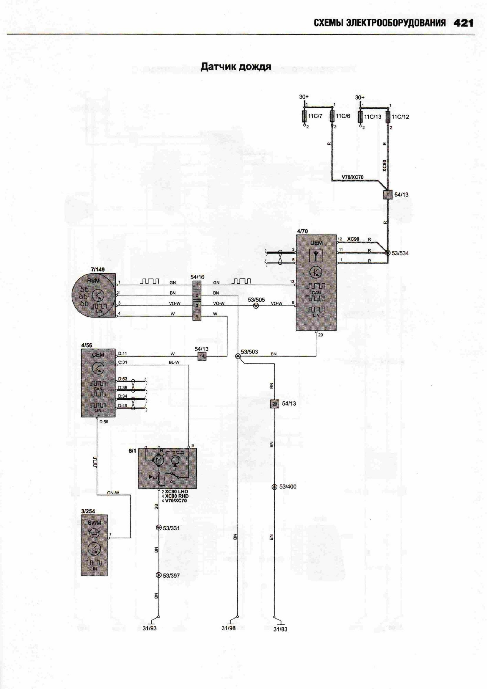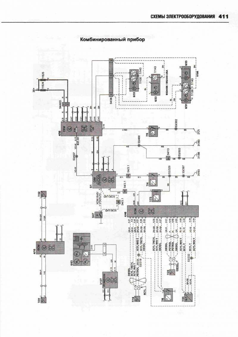 Принципиальные схемы электрооборудования автомобиля ВОЛЬВО ХС 90 с 2002 (двигатели типов бензин 2,5, 2,9, 3,2, 4,4 л и дизель 2,4). Начало сборника схем данного авто находится здесь. А тут вы можете посмотреть схемы фар и блока предохранителей. В Volvo 90 были разработаны активные биксеноновые фары, способные следовать направлению поворота автомобиля. Такие фары значительно повышают видимость в темное время. Процессор получает данные о различных параметрах движения автомобиля, проводит их анализ и настраивает систему для оптимального освещения дороги. Фары могут поворачиваться под углом до 15 градусов в каждом направлении, таким образом, общий диапазон поворота составляет 30 градусов. Это позволяет лучше и дальше освещать дорогу. Во избежание износа системы в дневное время функция поворота фар автоматически отключается. Ещё предлагается установка камеры для облегчения парковки. Это устройство, цель которого предотвратить наезд на людей при движении задним ходом и облегчить процесс парковки. Камера с большим углом охвата показывает зону сзади автомобиля. Причем система не только позволяет водителю видеть, что происходит сзади автомобиля, но она еще показывает планируемую траекторию движения задним ходом. Изображение выводится на экран навигационной системы, размещенный поверх панели приборов. Угол поля изображения охватывает всю зону за автомобилем, при этом обеспечивается минимальное искажение изображения. На экран выводятся вспомогательные линии, которыми обозначен периметр предполагаемой парковки после завершения требуемых маневров. Эти линии изменяются в зависимости от вращения рулевого колеса, помогая водителю сделать правильный выбор. Камера полностью интегрирована с системами авто.