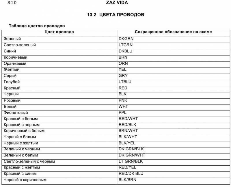 Цвета проводов - условные сокращения на схеме
