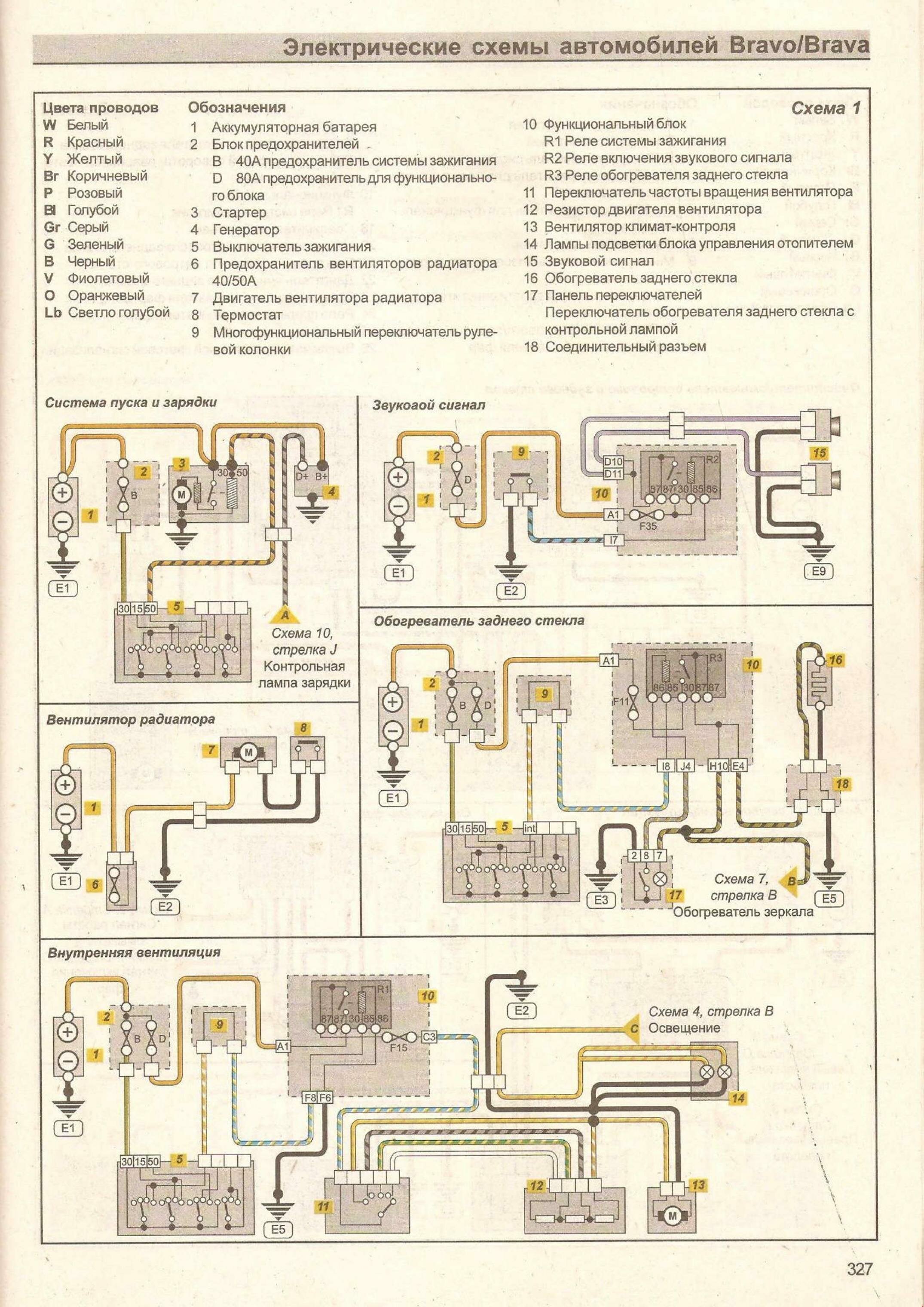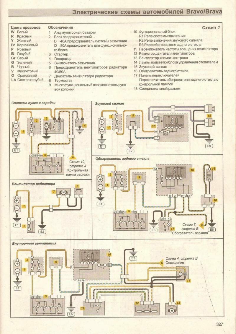 Принципиальные схемы электрооборудования на Фиат Брава 1995-2001 г.в. Пятидверный хэтчбек FIAT Brava выпускался с 1995 года по 2001 год. Родственником ФИАТ Брава является FIAT Bravо, у которого три двери. В 1995 году FIAT Brava получает громкое звание «Европейский Автомобиль Года». Предшественником ФИАТ Брава был автомобиль FIAT Tipo. На базе ФИАТ Брава в 1996 году увидел свет FIAT Marea, а в 1998 году на основе FIAT Brava был создан минивэн FIAT Multipla.