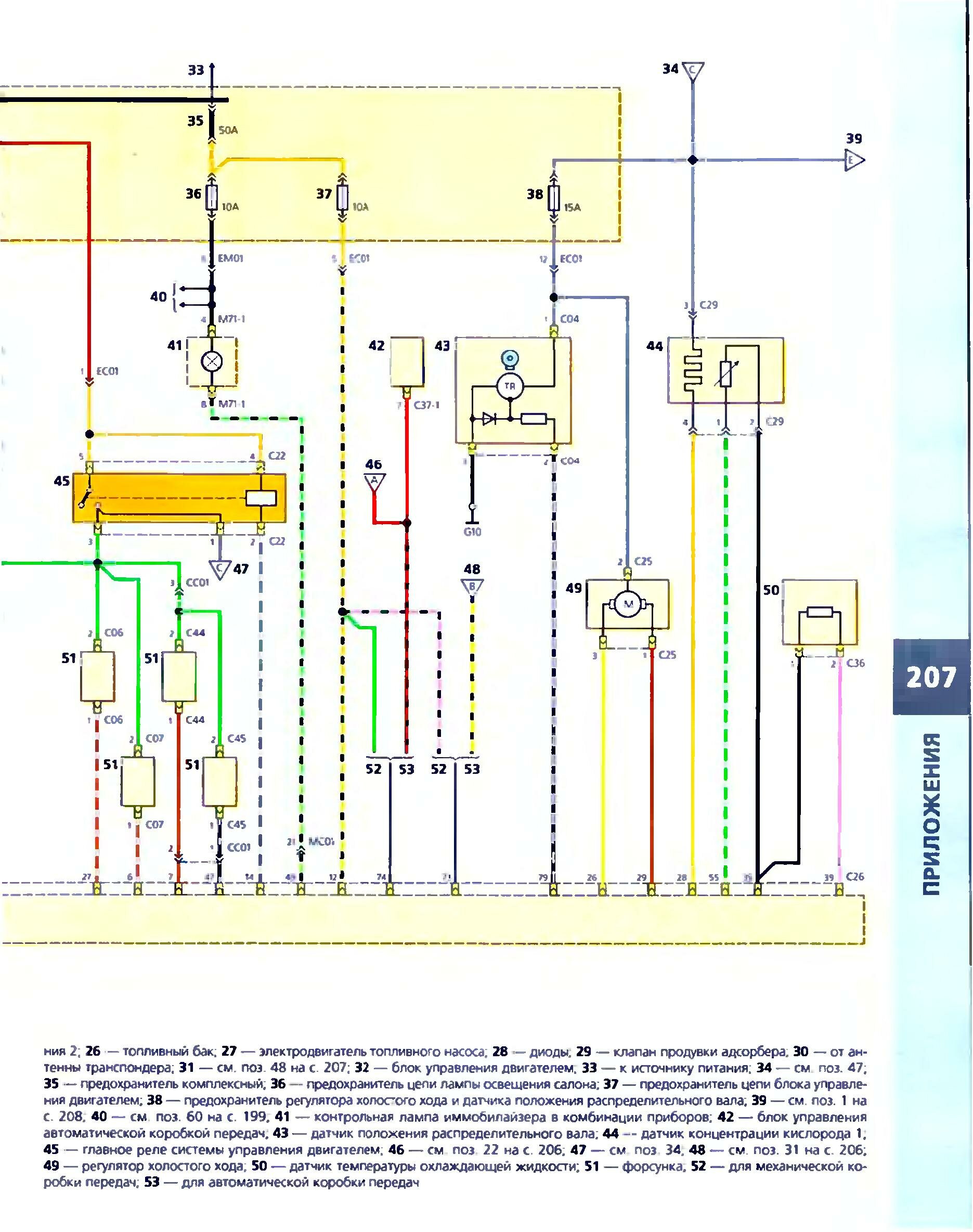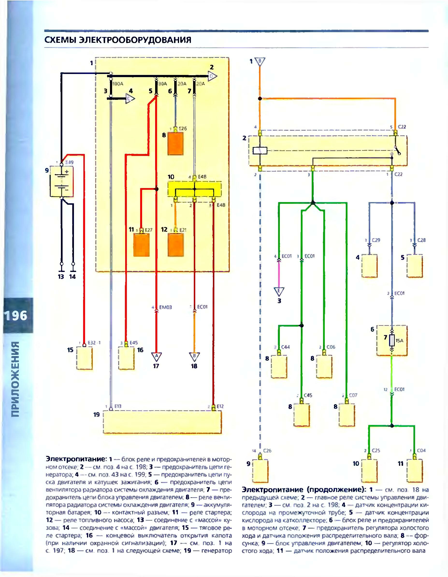 Бесплатный сборник цветных схем на русском языке электрооборудования автомобиля Hyundai Accent (1,5i) с 2000 года выпуска. Тут показан блок реле и предохранителей, а также некоторые другие модули. Продолжение каталога схем читайте далее. Предохранители служат для того, чтобы разрывать цепь, когда сила тока достигнет определенного значения, для того, чтобы защитить элементы и провода, которые могут быть повреждены слишком сильным током. Резкое увеличение силы тока обычно вызвано неисправностью в цепи, чаще всего коротким замыканием. Обозначения цепей, защищаемых предохранителями, указаны на крышке блока предохранителей.