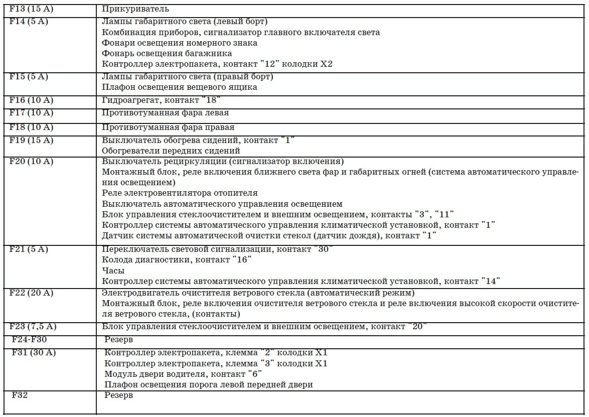 13 – предохранитель цепи питания бензонасоса (15 А)