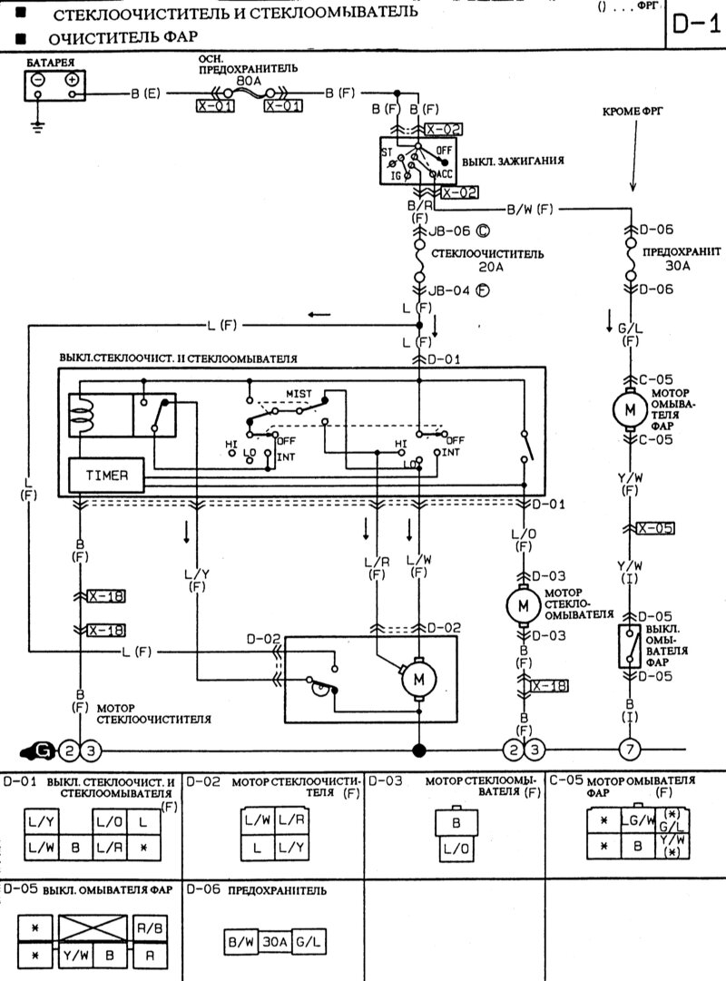 Качественные электросхемы автомобиля Мазда 323. Противотуманные фары, подсветка, сигнализация, распределение питания и устройство пускового блока. Предназначены для поиска неисправностей и ремонта. Предохранители служат для того, чтобы прервать цепь, когда сила тока превысит определенное значение, и защитить элементы и провода, которые могут быть повреждены слишком сильным током. Резкое увеличение силы тока обычно вызвано неисправностью в цепи, чаще всего коротким замыканием. Блок предохранителей расположен под панелью приборов со стороны водителя. Каждый из предохранителей защищает свою цепь, принадлежность его к той или иной цепи обозначена на крышке блока предохранителей. Для замены вышедшего из строя предохранителя предварительно выключите соответствующую электрическую цепь, извлеките предохранитель из гнезда пинцетом. Если вновь установленный предохранитель мгновенно выходит из строя при подаче напряжения, проверьте защищаемую электрическую цепь. Если предохранитель защищает несколько цепей, то их необходимо подключать поочередно, чтобы по перегоранию предохранителя определить неисправную цепь. Увеличить схему Мазда 323 можно кликнув по ней и развернув на весь экран с помощью значка сверху. Продолжение схем тут.