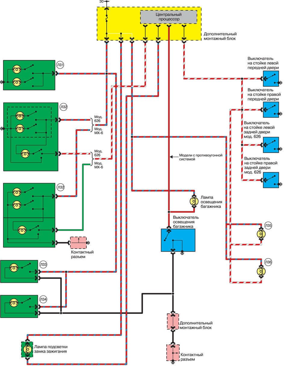 Качественные цветные электросхемы автомобиля Мазда-626 на русском языке. Предназначены для поиска неисправностей и ремонта. Система электрооборудования имеет напряжение 12 Вольт с отрицательным заземлением. Энергия для фар и всех элементов электрооборудования поступает от свинцово-кислотного аккумулятора, который подзаряжается от генератора переменного тока. Увеличить схему можно кликнув по ней и развернув на весь экран с помощью значка сверху. Начало сборника схем Мазда-626 тут. Приведены схемы для моделей 1993 и 1998 годов выпуска. Схемы двигателя авто показаны отдельно.