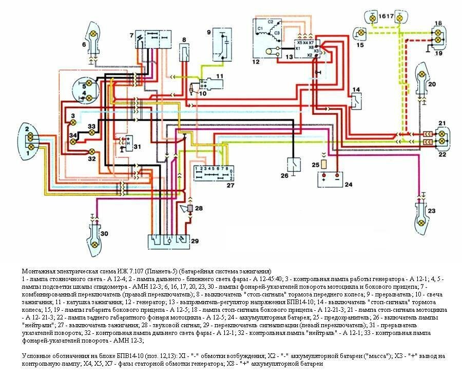 1 - лампа стояночного света - А 12-4; 2 - лампа дальнего - ближнего света фары - А 12-45:40; 3 - контрольная лампа работы генератора - А 12-1; 4, 5 - лампы подсветки шкалы спидометра - АМН 12-3; 6, 16, 17, 20, 23, 30 - лампы фонарей-указателей поворота мотоцикла и бокового прицепа; 7 - комбинированный переключатель (правый переключатель); 8 - выключатель "стоп-сигнала" тормоза переднего колеса; 9 - прерыватель; 10 - свеча зажигания; 11 - катушка зажигания; 12 - генератор; 13 - выпрямитель-регулятор напряжения БПВ14-10; 14 - выключатель "стоп-сигнала" тормоза колеса; 15, 19 - лампы габарита бокового прицепа - А 12-5; 18 - лампа стоп-сигнала бокового прицепа - А 12-21-3; 21 - лампа стоп-сигнала мотоцикла - А 12- 21-3; 22 - лампа заднего габаритного фонаря мотоцикла - А 12-5; 24 - аккумуляторная батарея; 25 - предохранитель; 26 - включатель лампы "нейтрали"; 27 - выключатель зажигания; 28 - звуковой сигнал; 29 - переключатель сигнализации (левый переключатель); 31 - прерыватель указателей поворота; 32 - контрольная лампа дальнего света фары - А 12-1; 32 - контрольная лампа "нейтраль" - А 12-1; 33 - контрольная лампа фонарей-указателей поворота - АМН 12-3;