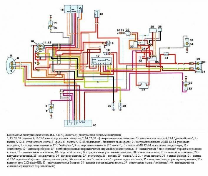 1, 13, 28, 32 - лампы А 12-21-3 фонаря-указателя поворота; 2, 14, 27, 33 - фонари-указатели поворота; 3 - контрольная лампа А 12-1 "дальний свет"; 4 - лампа А 12-4 - стояночного света; 5 - фара; 6 - лампа А 12-45-40 дальнею - ближнего света фары; 7 - контрольная лампа АМН 12-3-1 указателя поворота; 8 - контрольная лампа А 12-1 "нейтраль"; 9 - контрольная лампа А 12 "масло"; 10 - лампа АМН 12-3-1 освещение спидометра; 11 - спидометр; 12 - щиток приборов; 15 - комбинированный переключатель (правый переключатель); 16 - выключатель "стоп-сигнала" тормоза переднего колеса; 17 - выключатель зажигания; 18 - звуковой сигнал; 19 - прерыватель указателей поворота; 20 - свеча зажигания; 21 - свечной наконечник; 22 - катушка зажигания; 23 - коммутатор; 24 - предохранитель; 25 - генератор; 26 - датчик; 29 - лампа А 12-21-4 стоп-сигнала; 30 - задний фонарь; 31 - лампа А 12-5 заднего габаритного фонаря мотоцикла; 34 - выключатель "стоп-сигнала" тормоза заднего колеса; 35 - выпрямитель-регулятор напряжения; 36 - конденсатор 2200 мкф 63В; 37 - аккумуляторная батарея; 38 - клапан-датчик подачи масла; 39 - включатель лампы "нейтраль"; 40 - переключатель сигнализации (левый переключатель).