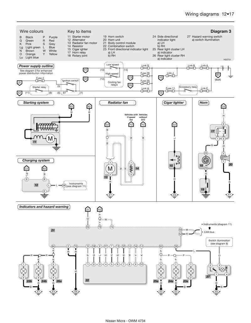 Обозначение элементов и проводов на схемах Nissan Micra