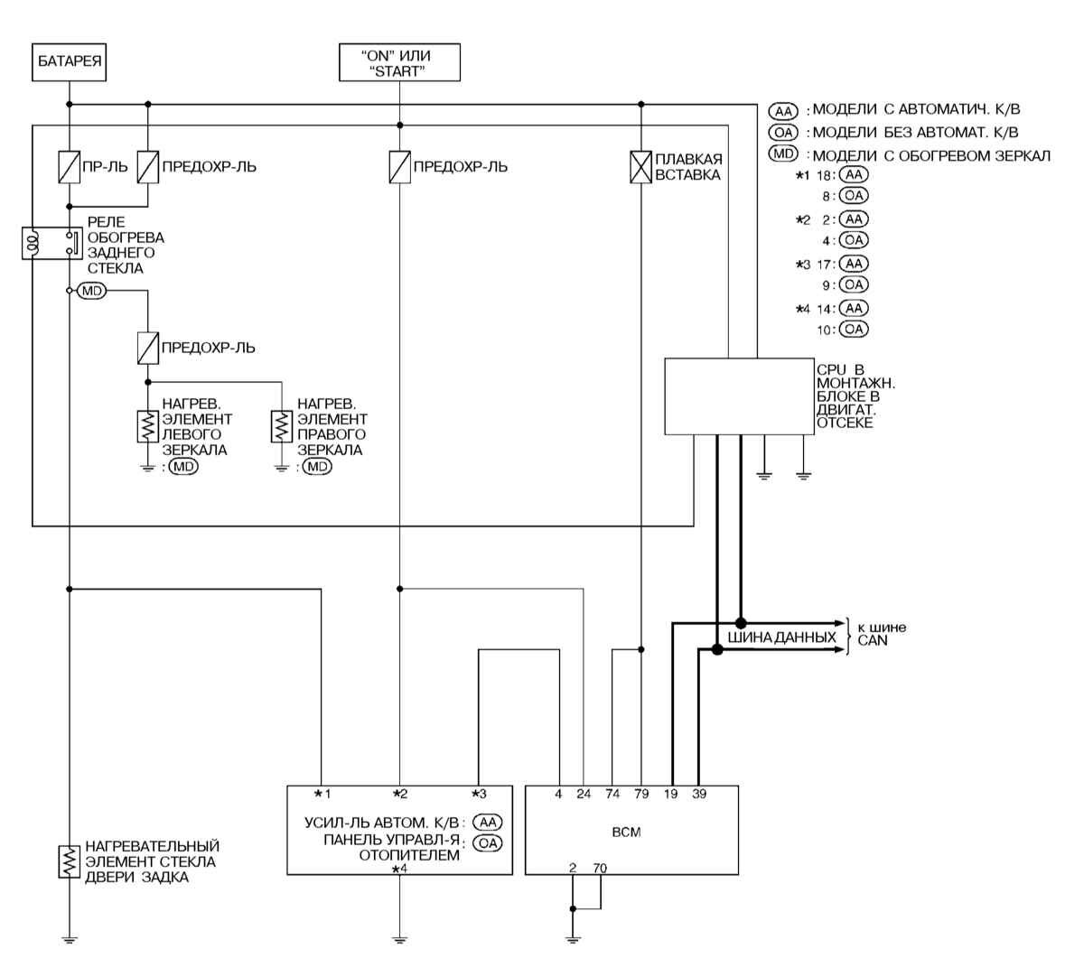 Электросхема обогрева заднего стекла и наружных зеркал заднего вида