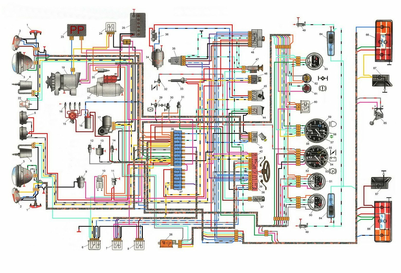 1 - боковые указатели поворота; 2 - передние фонари; 3 - фары; 4 - электродвигатели очистителей фар; 5 - звуковые сигналы Нива; 6 - реле включения очистителей и омывателя фар; 7 - реле включения ближнего света фар; 8 - реле включения дальнего света фар; 9 - электродвигатель омывателя ветрового стекла; 10 - датчик недостаточного уровня тормозной жидкости; 11 - штепсельная розетка переносной лампы; 12 - датчик контрольной лампы давления масла; 13 - датчик указателя давления масла; 14 - датчик указателя температуры охлаждающей жидкости; 15 - распределитель зажигания; 16 - свечи зажигания; 17 - электродвигатель стеклоочистителя; 18 - катушка зажигания; 19 - генератор; 20 - запорный клапан карбюратора; 21 - стартер; 22 - электродвигатель омывателя фар; 23 - регулятор напряжения; 24 - реле контрольной лампы заряда аккумуляторной батареи; 25 - аккумуляторная батарея; 26 - реле стеклоочистителя; 27 - дополнительный блок предохранителей; 28 - основной блок предохранителей; 29 - выключатель контрольной лампы стояночного тормоза; 30 - выключатель контрольной лампы блокировки дифференциала; 31 - выключатель света заднего хода; 32 - выключатель контрольной лампы воздушной заслонки карбюратора; 33 - выключатель стоп-сигнала; 34 - электродвигатель отопителя; 35 - реле-прерыватель указателей поворота и аварийной сигнализации; 36 - дополнительный резистор электродвигателя отопителя; 37 - выключатель освещения приборов; 38 - переключатель света фар; 39 - переключатель указателей поворота; 40 - выключатель звуковых сигналов; 41 - переключатель стеклоочистителя; 42 - выключатель омывателя ветрового стекла; 43 - выключатель зажигания; 44 - выключатель наружного освещения; 45 - переключатель отопителя; 46 - выключатель очистителей и омывателя фар; 47 - прикуриватель; 41 - выключатель аварийной сигнализации; 49 - выключатели плафонов, расположенные в стойках дверей; 50 - указатель давления масла с контрольной лампой недостаточного давления; 51 - указатель уровня топлива с контрольной лампой резерва топлива; 52 - тахометр Нива; 53 - контрольная лампа стояночного тормоза; 54 - контрольная лампа заряда аккумуляторной батареи; 55 - контрольная лампа воздушной заслонки карбюратора; 56 - спидометр; 57 - контрольная лампа наружного освещения; 58 - контрольная лампа указателей поворота; 59 - контрольная лампа дальнего света фар; 60 - реле-прерыватель контрольной лампы стояночного тормоза; 61 - контрольная лампа уровня тормозной жидкости; 62 - контрольная лампа блокировки дифференциала; 63 - указатель температуры охлаждающей жидкости; 64 - плафоны ваз 2121; 65 - датчик указателя уровня и резерва топлива; 66 - задние фонари; 67 - фонари освещения номерного знака.