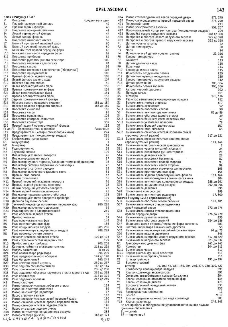 Электросхемы автомобиля Опель Аскона модельного ряда 1983-1988 годов, а именно: Opel Ascona 1984, Opel Ascona 1985, Opel Ascona 1986, Opel Ascona 1987, Opel Ascona 1988. На отдельных картинках приводятся расшифровки и обозначения элементов на схемах. Наименование элементов приведены в соответствии с DIN 40719, обозначение линий в соответствии с DIN 47002. Некоторое наложение участков схем Opel Ascona C облегчает чтение. Предназначено для специализированных автомастерских.
