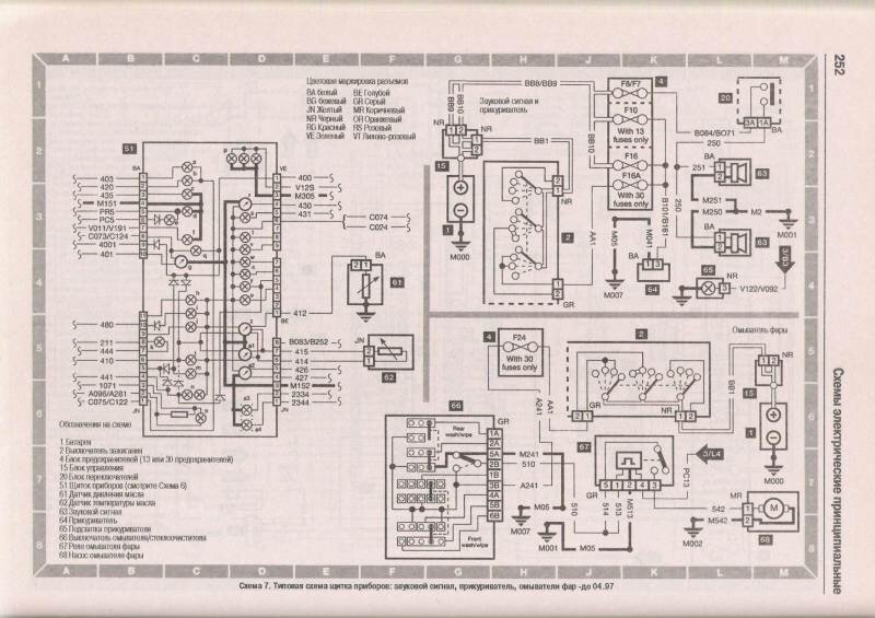 Указана батарея, выключатель зажигания, блоки предохранителей, контрольные лампы уровней и другие элементы схемы.