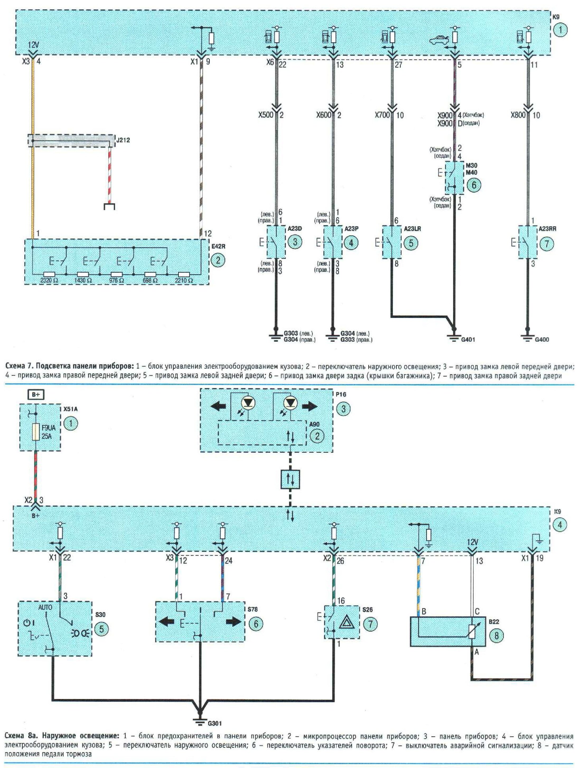 Цветные схемы электрооборудования автомобиля Chevrolet Aveo с 2011 года, модификация T300. Показаны русскоязычные схемы и соединения электрической проводки узлов приборов автомобиля Шевроле Авео. Соединение приборов, соединения звукового сигнала, стеклоочиститель и омыватель ветрового стекла, соединения стеклоподъемников передних дверей, соединения комбинации приборов, антиблокировочная система тормозов, система управления двигателем и другие. Схемы для более старой версии Aveo смотрите здесь.