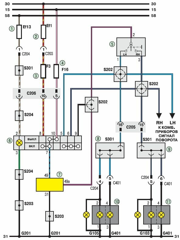 1 - плавкая вставка (10 А); 2 - плавкая вставка (80 А); 3, 4 - предохранители (15 А); 5 - переключатель указателей поворота; 6 - выключатель аварийной сигнализации; 7 - реле; 8, 9 - соединительные колодки; 10 - лампа указателя левого поворота в комбинации приборов; 11 - лампа указателя правого поворота в комбинации приборов